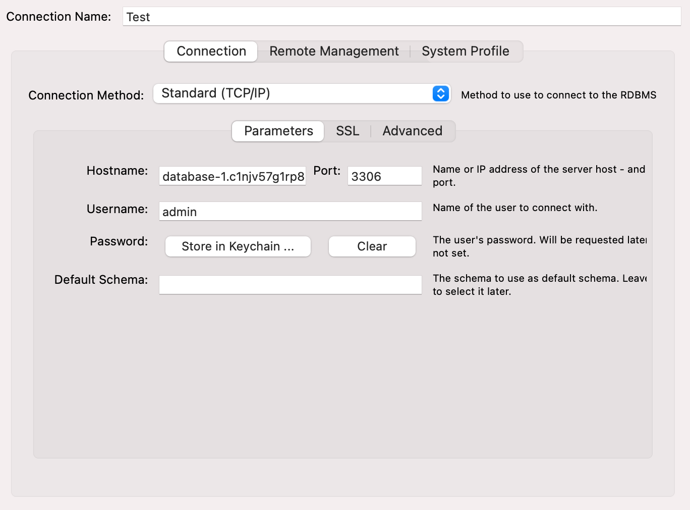 2. connection 설정에서 Hostname에 RDS의 엔드포인트를 넣어주고, RDS에서 설정한 유저네임과 패스워드를 입력한다.