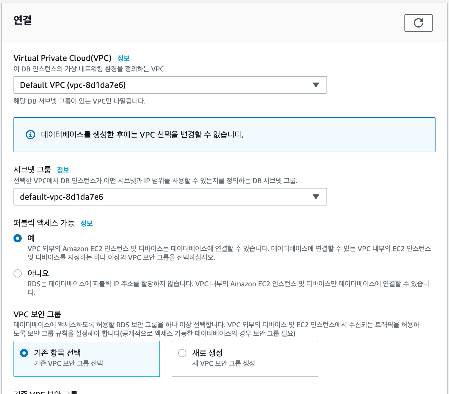 6. 실제 상용 서버에 RDS를 만들때는 퍼플릭 액세스를 '아니요'로 해두어야 한다. 그래야 Amazon EC2 내부에서만 DB에 접근이 가능하다. 하지만 공부용으로 만드는 RDS이기 때문에 퍼블릭 액세스를 '예'로 해서 외부에서도 접근이 가능하도록 만들어주었다.