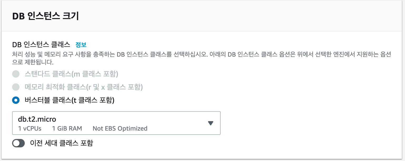 5. 프리티어 DB의 인스턴스 크기를 아래와 같이 고정되어 있다.