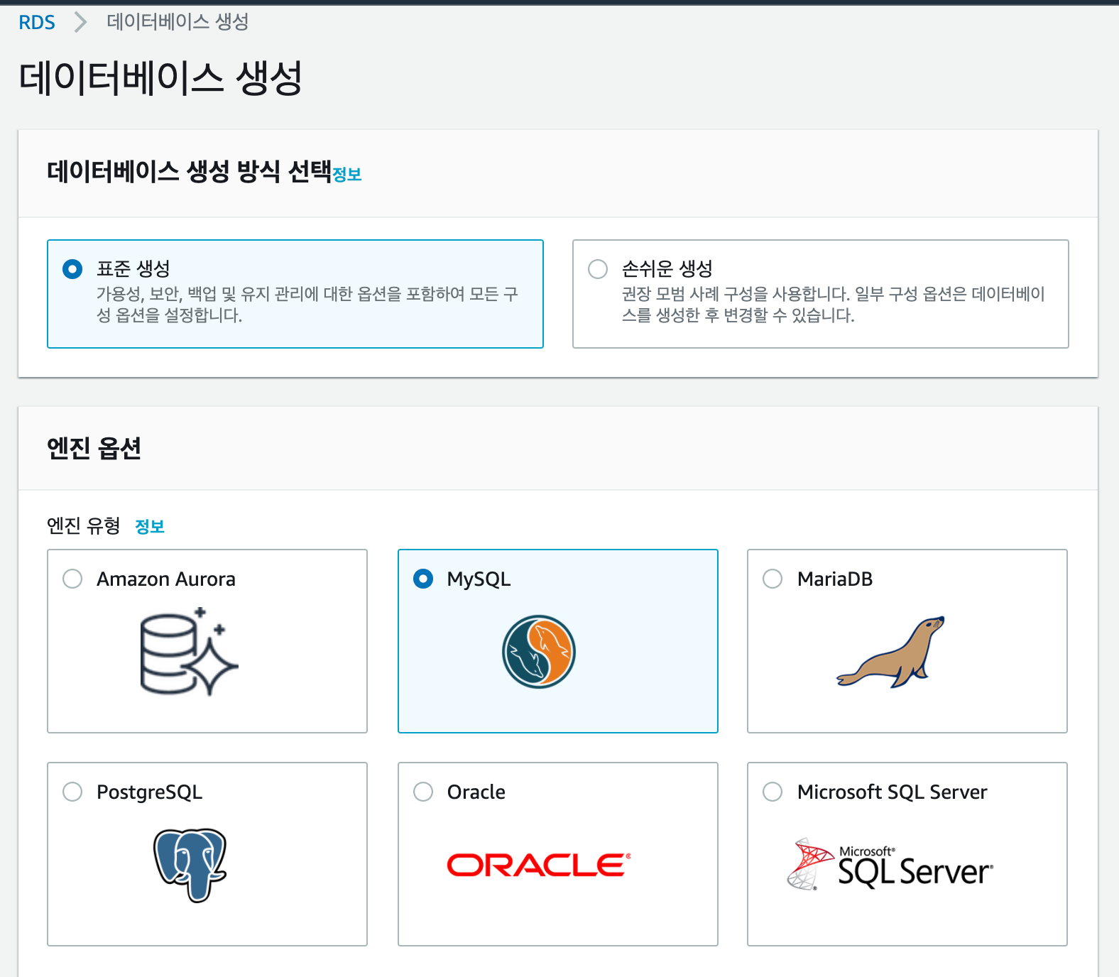 2. 나는 무료로 사용할 수 있는 mysql를 사용하고 있기 때문에 엔진 옵션을 mysql로 선택해 주었다. 아래에 보이는 엔진 옵션들이 현재 AWS에서 지원하는 관계형 데이터베이스 관리 시스템 리스트이다.
