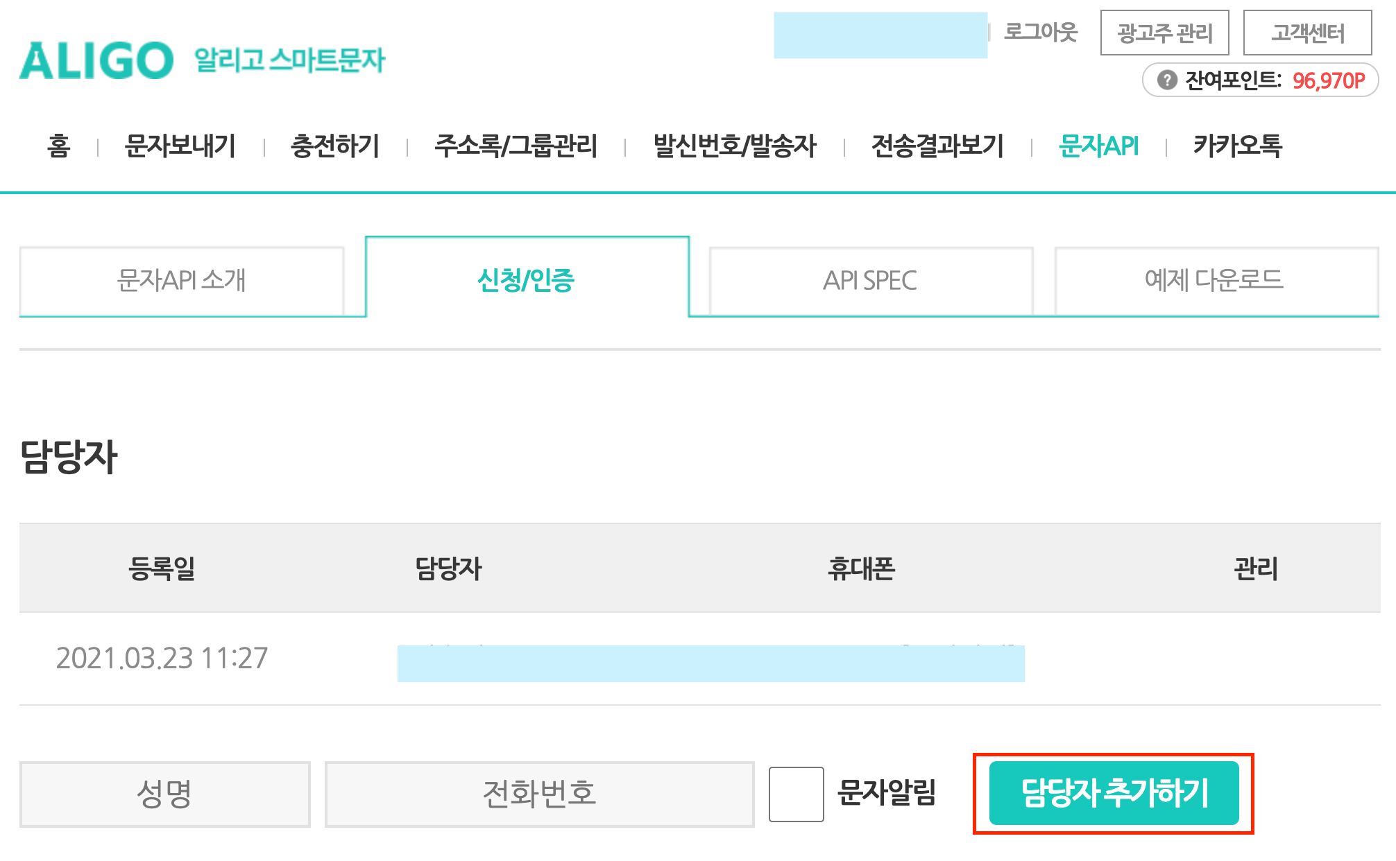- 담당자 추가하기 : 알리고 홈페이지에서 문자 API 페이지 신청/인증 탭으로 가면 담당자 정보를 추가할 수 있습니다. 해당 정보에 알리고 문자 발송에 대한 담당자명과 전화번호를 추가합니다. 아래 화면에선 이미 추가된 담당자 정보가 있고 '담당자 추가하기'를 클릭하여 여러 명의 다수의 담당자를 등록할 수 있습니다.