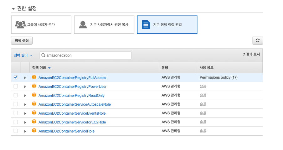 EC2권한을 설정할때는 EC2에 대한 FullAccess를 가지고 있는 정책을 선택해주었습니다.